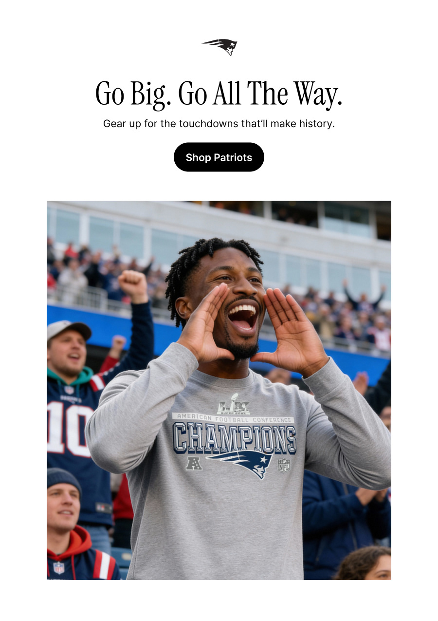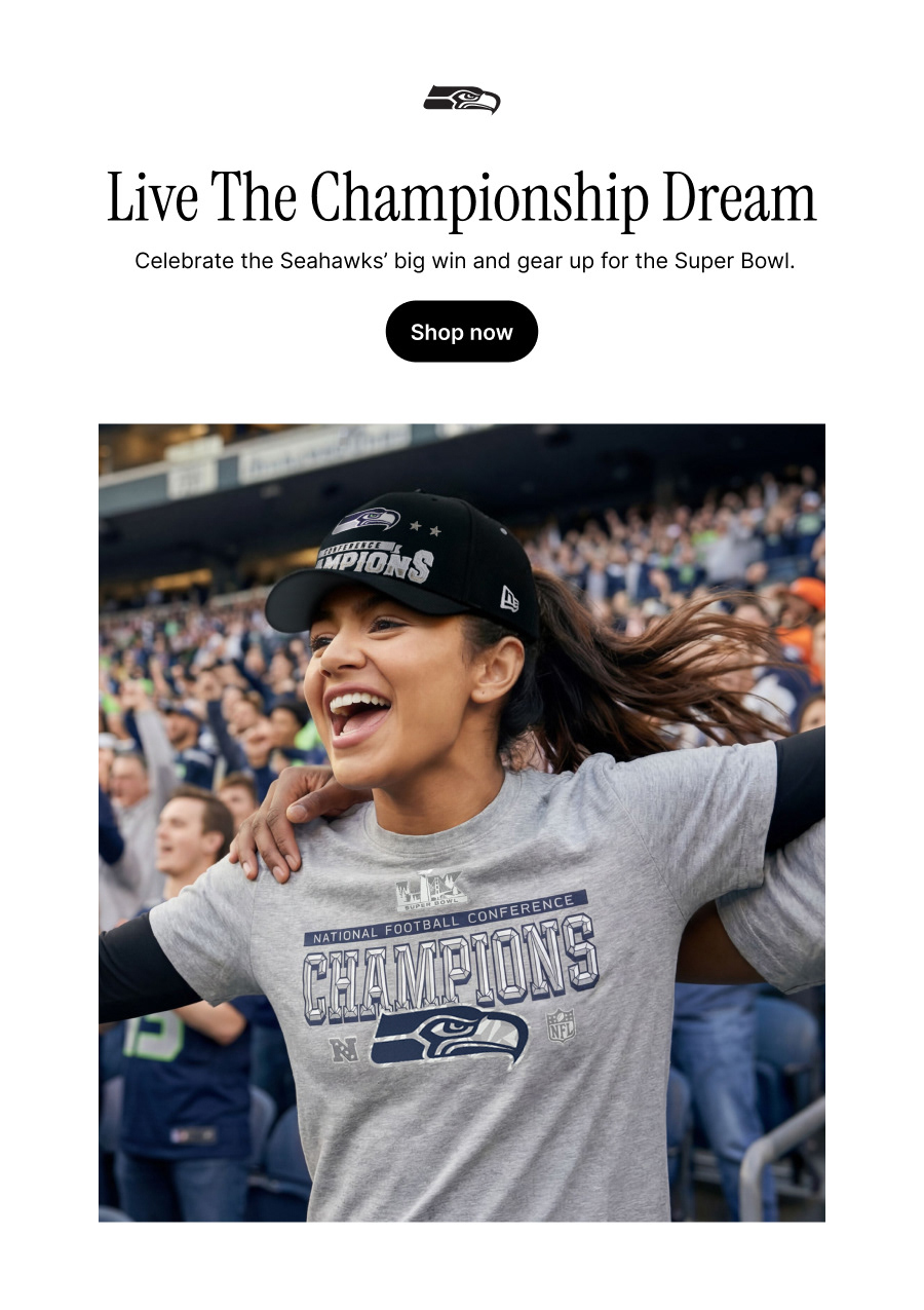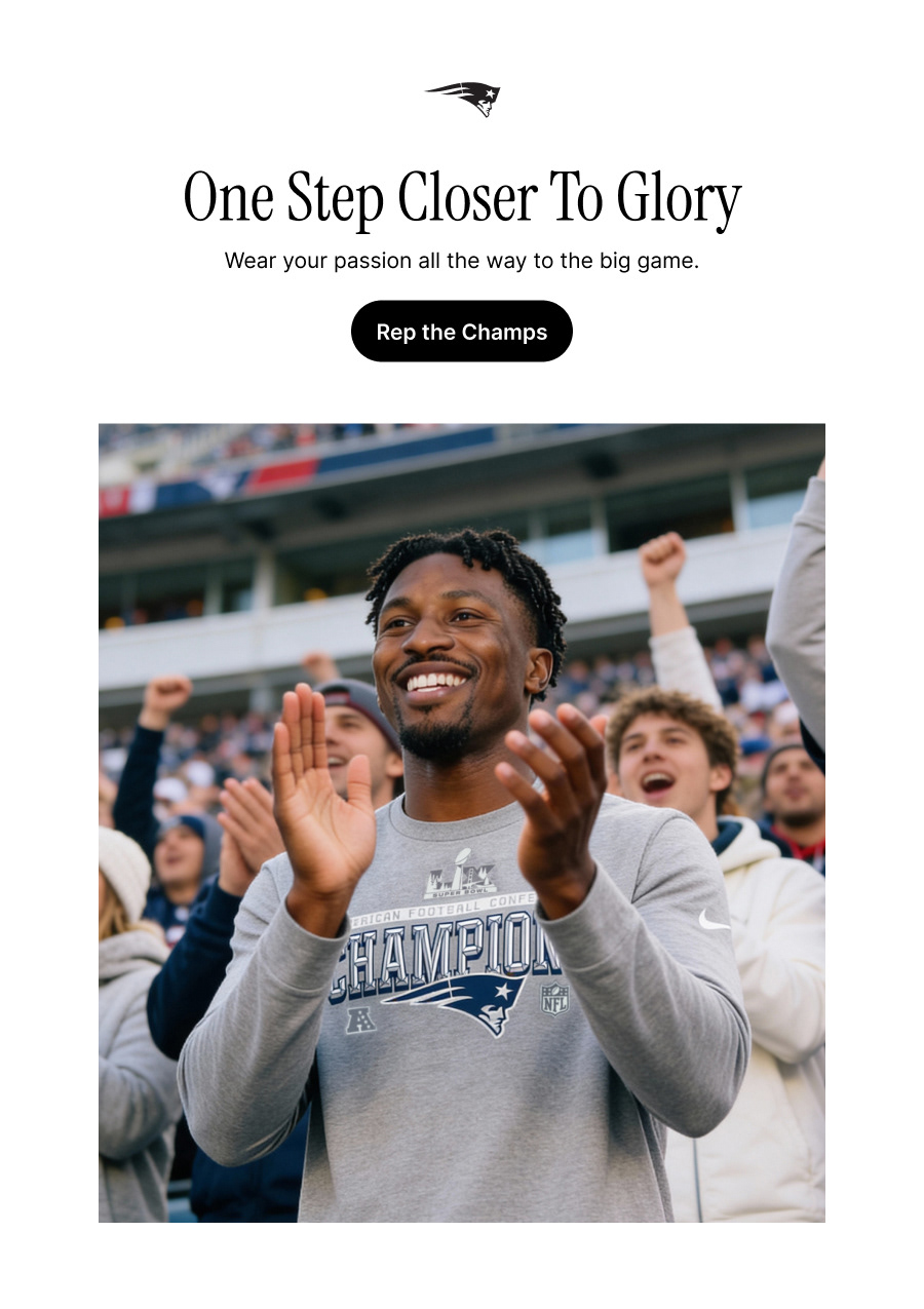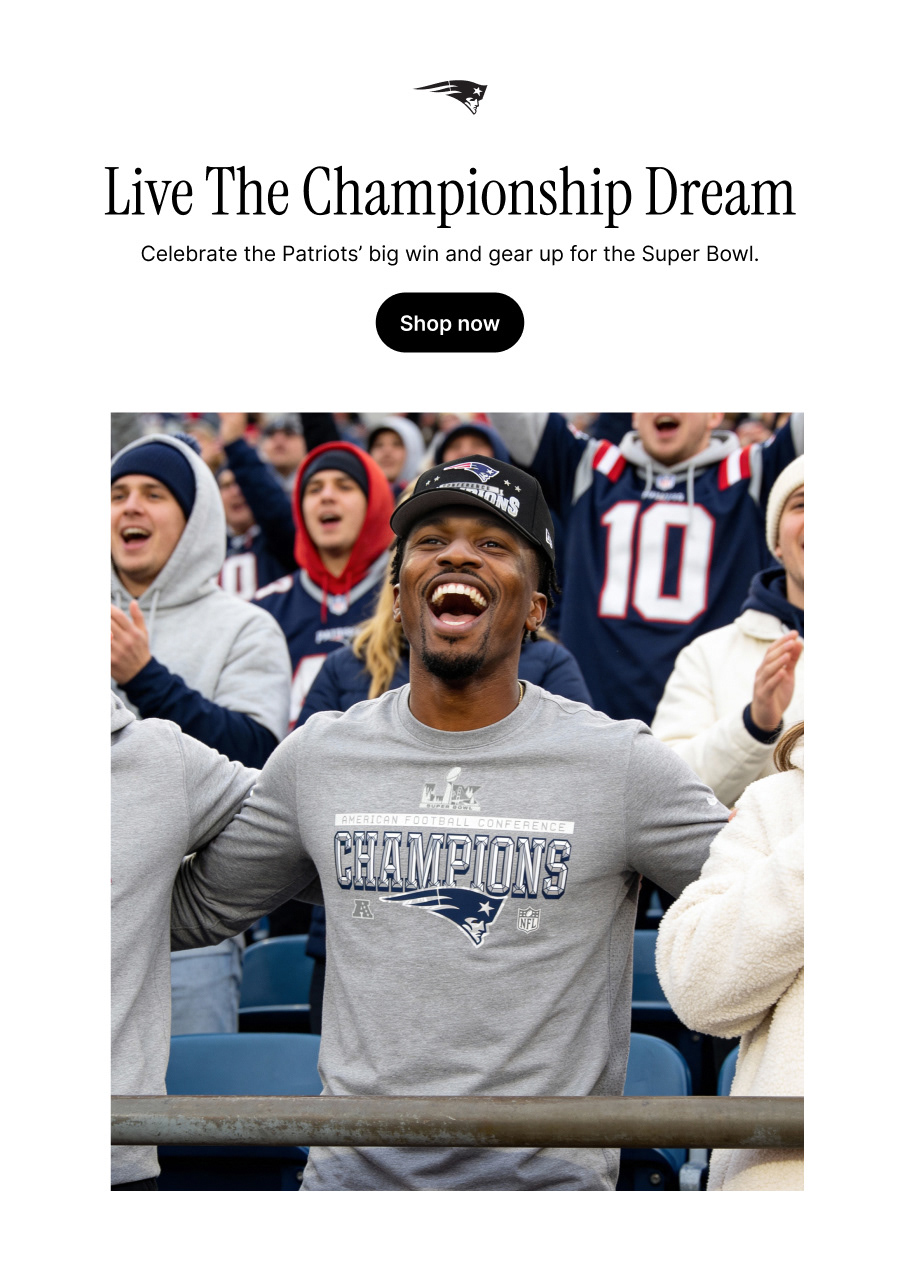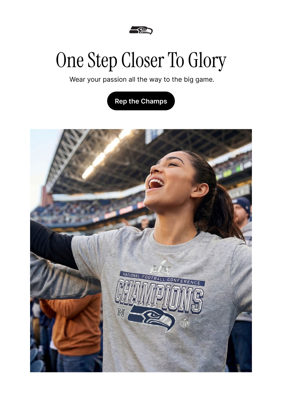 There's nothing like a Super Bowl run-in, especially for fans who've dreamt of it for decades and watched every season with prayers on their lips and jerseys on their backs. These personalized emails were aimed at those diehard fans—a series of three emails timed to amplify the winning feeling, right after the NFC and AFC finals.