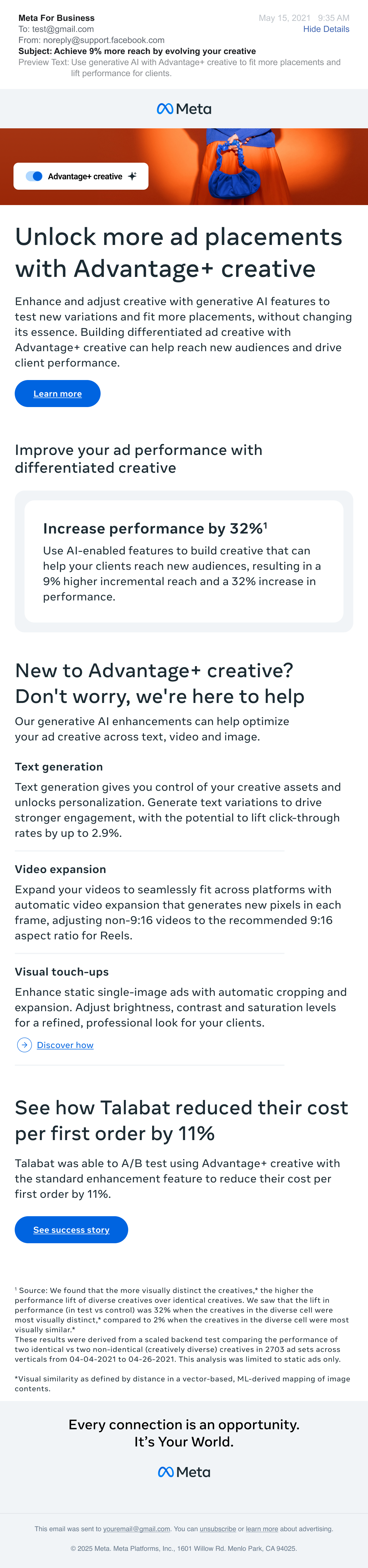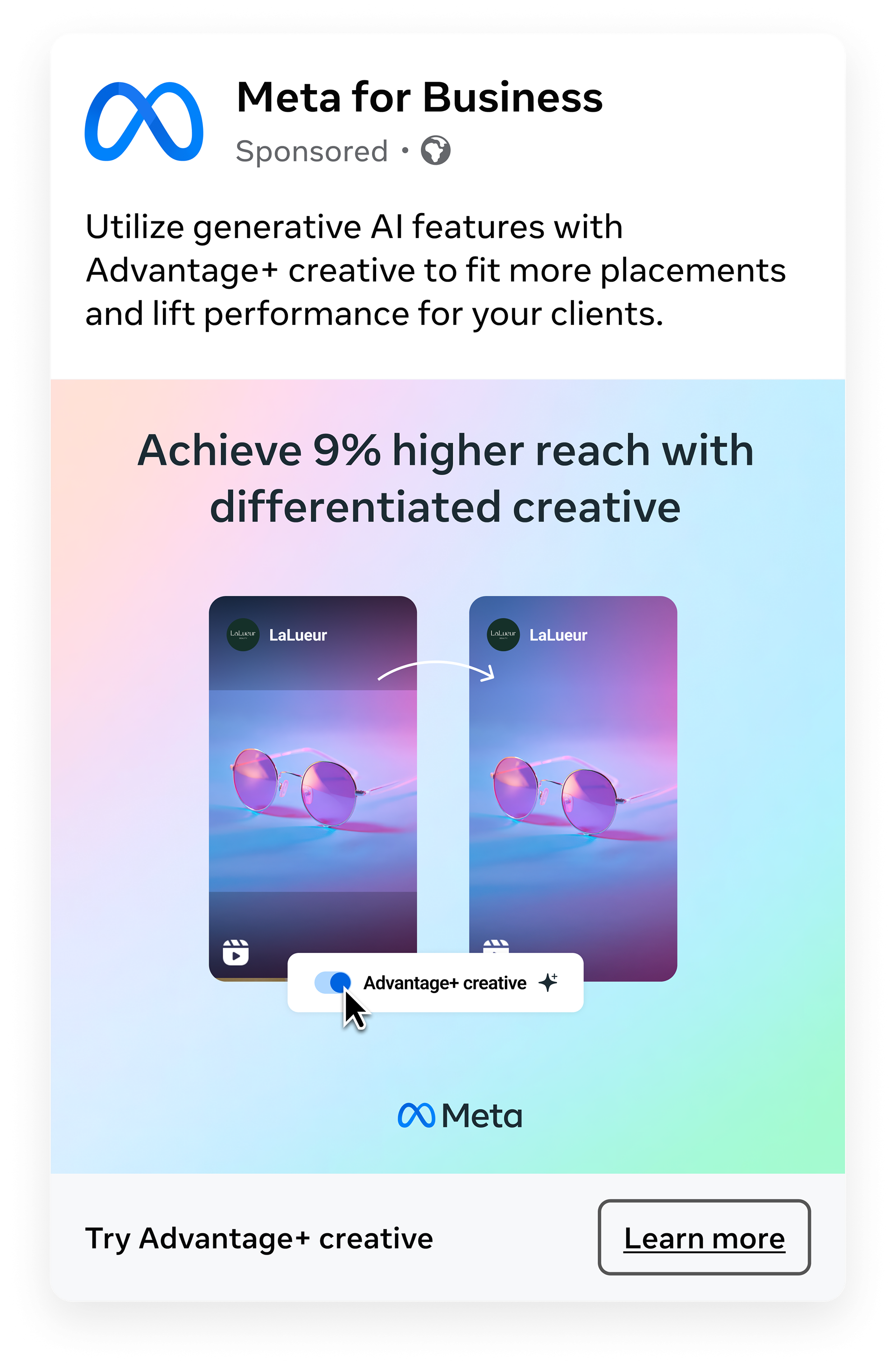 The goal was to push Advantage+ Creative as a GenAI suite, including features like text variations, video expansion, and visual touch-ups. Large agencies are often stretched thin, so we showcased how GenAI could help them save time and resources and produce successful client campaigns.
